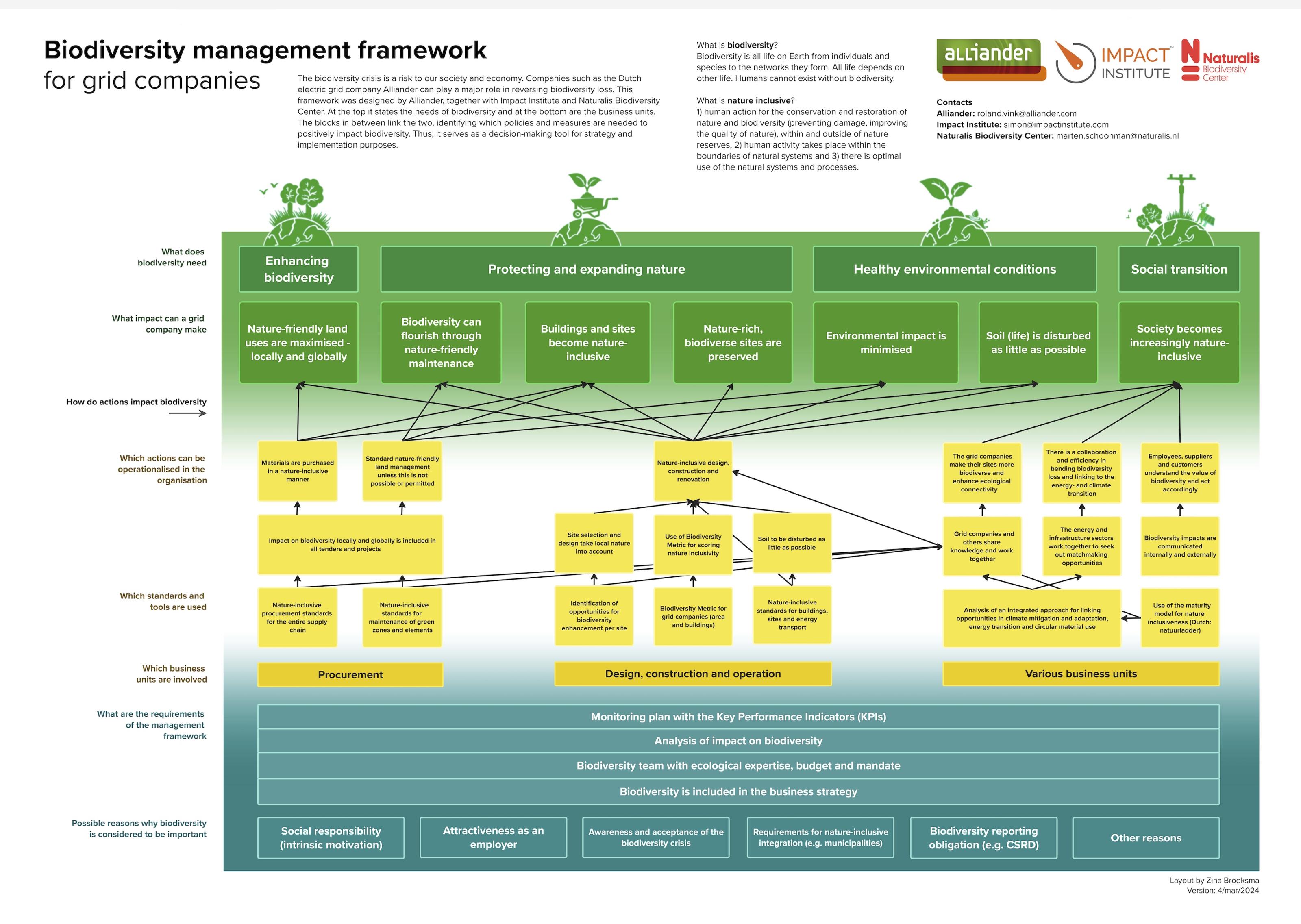 The biodiversity crisis is a risk for our society and economy. Organizations can do something about this by taking biodiversity-conscious steps. But where to start as an organization? Alliander, Impact Institute and Naturalis Biodiversity Center have developed a management framework for biodiversity that shows how an organization can organise themselves to have a positive impact.
