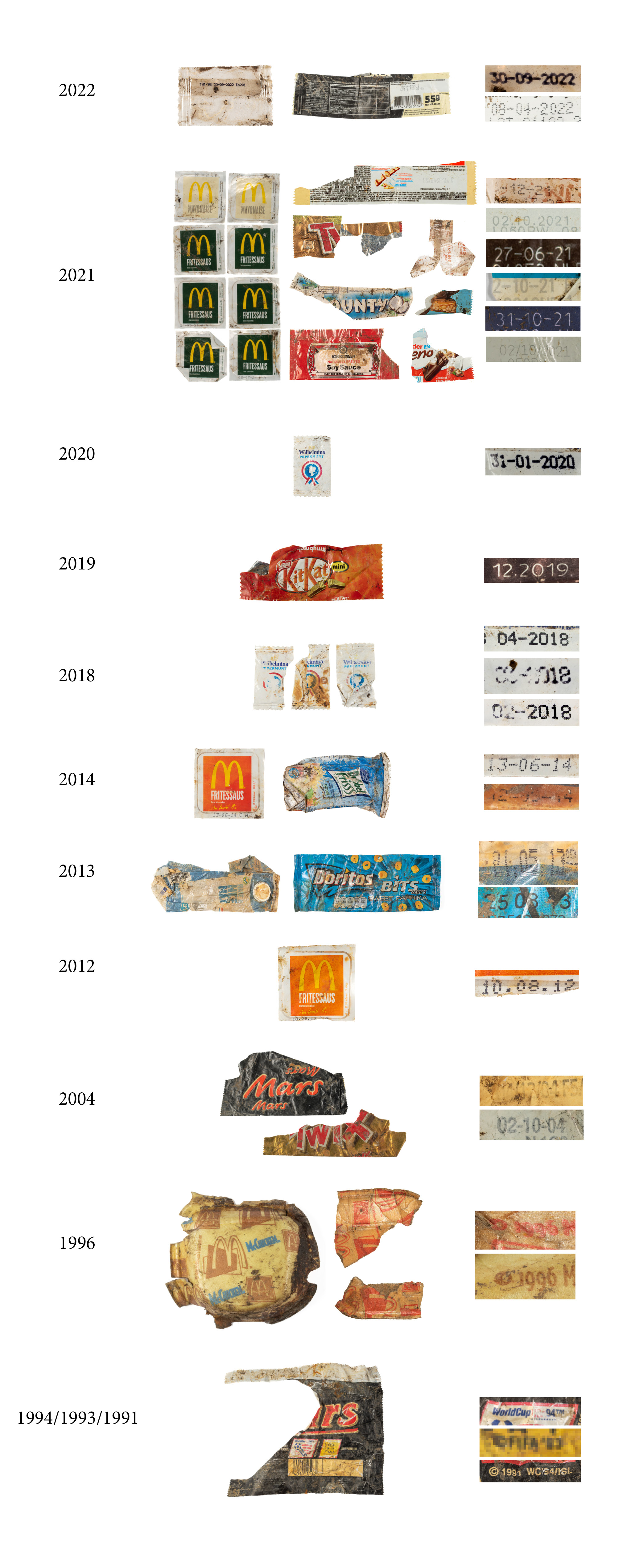 A significant proportion of the dateable waste materials from the Rokin nest were found to come from fast food packaging, particularly from the McDonald's around the corner. From polystyrene packaging from the McChicken, dating as far back as 1996, to recent fries sauce containers. As one of the biggest polluters worldwide, McDonald's waste is very consistent marker in the layers of plastic we now leave behind. Hiemstra: ‘The “McDonald's archaeology” says something about our “throwaway culture” and it shows that “away” in throwaway, doesn't actually mean anything. Roughly 80% of all the plastic ever produced still exists.’