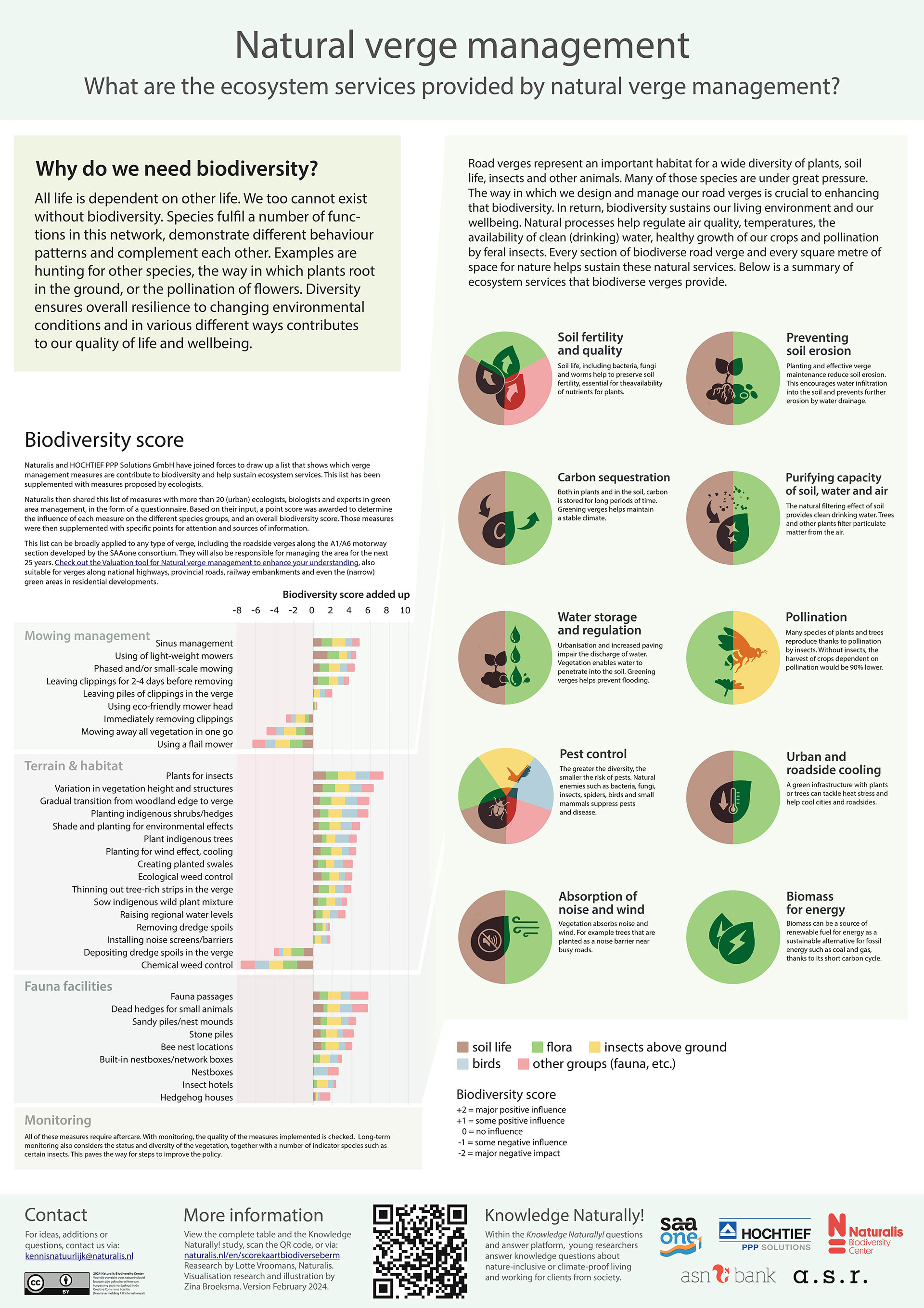 What are the ecosystem services of nature-inclusive roadside management? HOCHTIEF PPP Solutions (hereinafter HOCHTIEF), responsible for the operations and maintenance of many roads and their side verges, is already actively executing a variety of (green) measures to enhance the biodiversity in the roadside verges and surrounding areas, like in the SAAone project (A1/A6). However, the direct and indirect effects of these measures are not always clear. That is why they reached out to the research team of Naturalis, including Naturalis researcher Lotte Vroomans, who provided insight into which measures contribute to a biodiverse verge, and how they relate to the various ecosystem services. This acquired knowledge is summarized on a clear poster and scorecard.