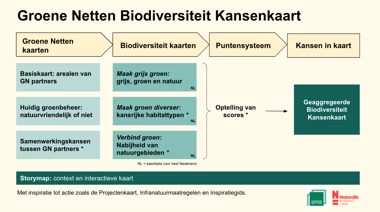 Samen vormen ze de geaggregeerde biodiversiteit kansenkaart. De bovenstaande kaartlagen heeft Naturalis gecombineerd tot een algemene kansenkaart aan de hand van een rekenmodel met punten per blok van 100x100 m per kaartlaag. Op deze geaggregeerde kaartlaag worden de totaalscores van de losse kaartlagen opgeteld en laat zo de meest kansrijke locaties zien om op meerdere onderwerpen zoals hierboven aangegeven verbetering te realiseren en kansen (bijvoorbeeld samenwerking bij vergroening) te benutten.